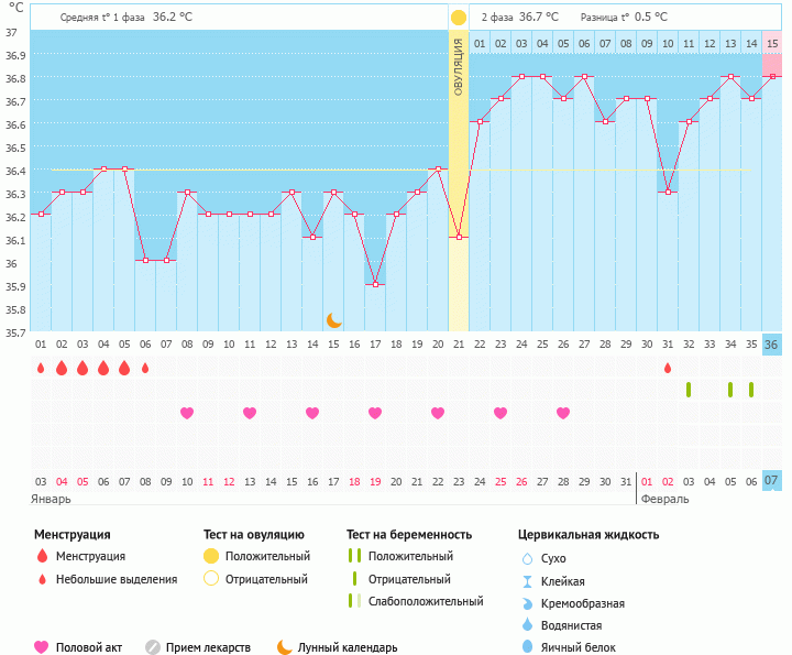 Цикл стабильный, 33-34 дня. Вторая фаза 13-14 дней. БТ падает за 2 дня до месячных.