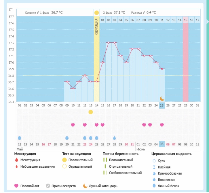 Это мой четвёртый график: температура второй фазы ровной никогда не была, но падала ровно на 14 день. На этом графике падение подозрительно рано. Выходит, желтое тело больше не вырабатывает прогестерон и новый цикл начнётся раньше?