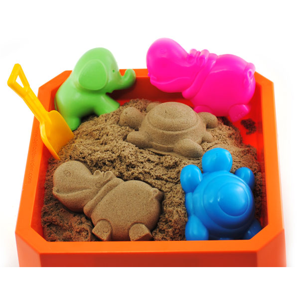 Kinetic Sand похож на мокрый пляжный песок, но в то же время он мягкий и пушистый, и течет сквозь пальцы, оставляя при этом руки чистыми и сухими. Kinetic Sand не рассыпается как обычный песок и очень легко собирается даже если попадет на ковер.