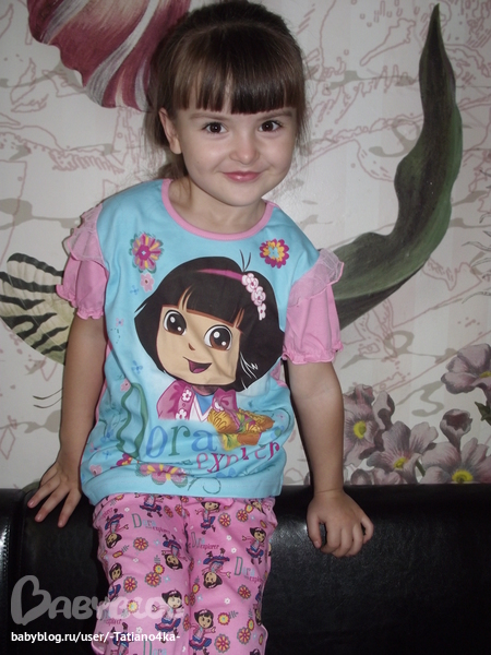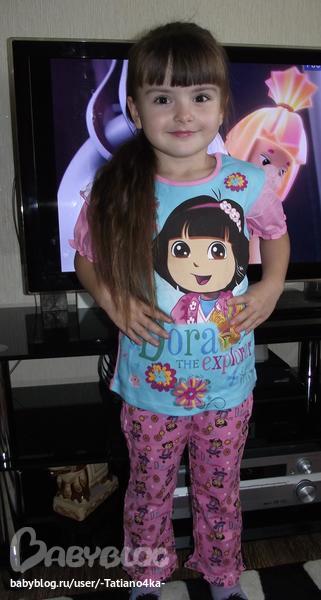 У "Доры" 5Т: - дл.штанишек от пояса 61см, по внутр. шву 37см, ширина где-то 34см; 1/2 ширины футболки 36см, длина по спинке 45см.