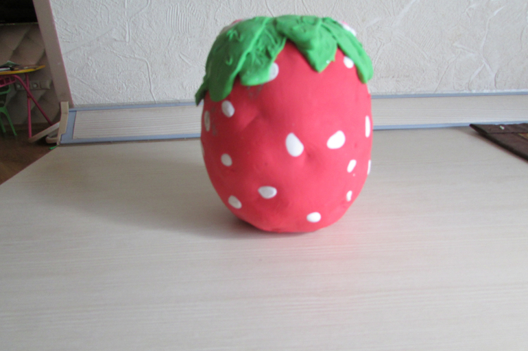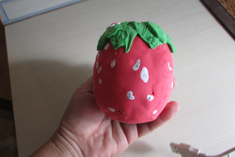 Затем делали у клубнички точечки. По инструкции нужно было пинцетом брать маленькие кусочки белой массы и приклеивать на ягодку. Плюнули на инструкцию, просто отрывали маленькие кусоки (мама), дети катали маленькие мячики и пальцем приклеивали мячик (распластывали, одним словом))) на ягодку. Поэтому точки у нас такие "идеально ровные" и с ямками.