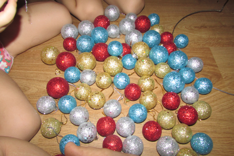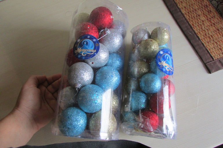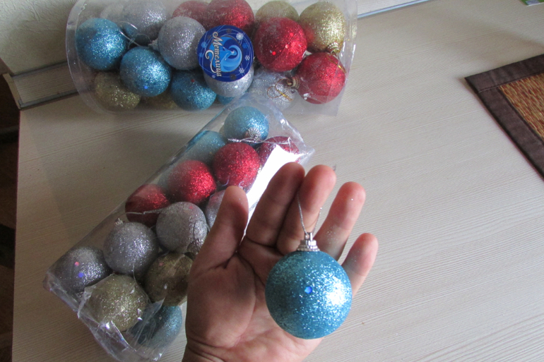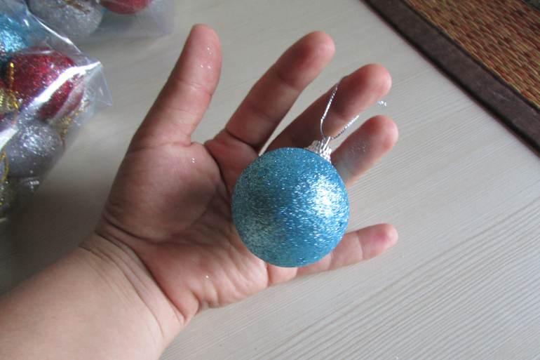 Шарики по моим ощущениям сделаны из пенопласта с напылением цветных блестючек, которые, конечно, прилипают к рукам, но куда ж без этого.
