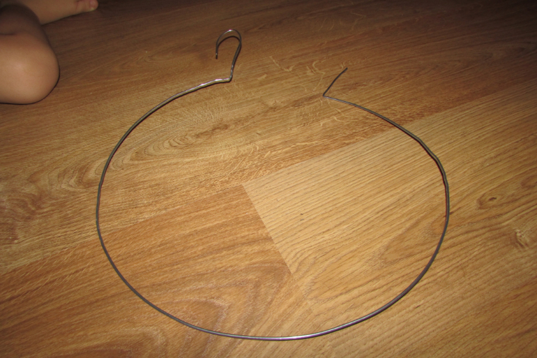 Самое сложное оказалось для меня - поиск вешалки))), Но потом сходила в ТЦ "Самолет", там внизу есть химчистка, увидела такие вешалки, вместе с детьми просящими глазами попросили продать нам 1 вешалку, нам подарили 3 штуки))). Счастью не было предела)). Крючок для "повешения" сделал позагибистее, а остальную проволоку муж выпрямил плоскогубцами и сделал нам подобие кольца.