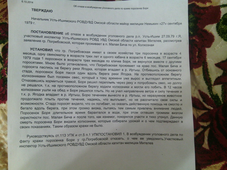 Да, старенькая история)))) а как тебе эта? Тоже реальная!Приятель мой служил в СКМ (Служба криминальной милиции) по заказным убийствам. И как-то раз заскочила я к нему. В отделе все чего-то читают и чешут свои репы.Спрашиваю, мол чё такое. Показывают отказной материал, т.е. отказ в возбуждении уголовного дела. Завязка сюжета такова. Выловили из реки сумку, в ней труп, замотанный скотчем.Читаю дальше.«Оперативно-розыскными мероприятиями установлено: гражданин Иванов В.В. такого-то числа стоял на мосту и производил манипуляции со скотчем. При порыве ветра он запутался в скотче, перегнулся через парапет и упал в подвешенную по мостом спортивную сумку. Лямки сумки оборвались и Иванов В.В. упал в реку (лямки на самом деле были оборваны). Течение в реке составляет столько-то км/ч. Из-за трения молнии сумки о камни дна сумка застегнулась...Отказать в возбуждении уголовного дела по статье 5, ч.2 УК РСФСР за отсутсвием состава преступления.»Прокурор это дело подписал.Самое смешное, что взятку получал не прокурор, не опер, не его начальник. Подобные шедевры научной фантастики стряпаются у нас совершенно бескорыстно, ибо на "процент раскрываемости" принято молиться во всех подразделениях испокон веков.