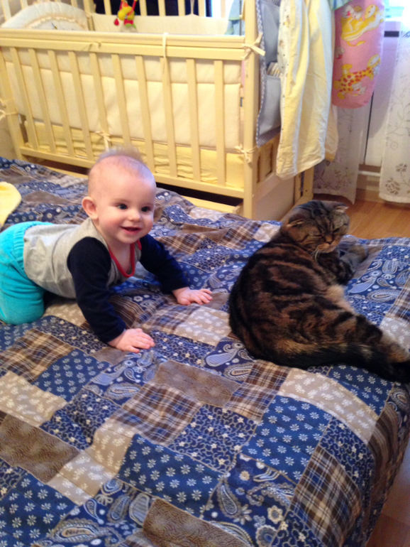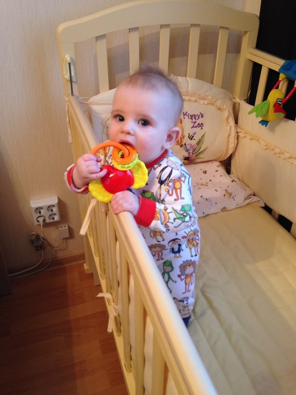 Значит так, вес 8630, рост 68,5. Кушает каши на завтрак и ужин, овощи и мясо на обед, на полдник пюрешки фрукты и печеньки. Пьет компот из сухофруктов. Кушает хорошо, какает хорошо, набирает вес только только, я списываю это на хороший обмен веществ и на его подвижность. В 6,5 месяцев Вова сел, в 7 встал на ноги в кроватке и манеже. Сейчас уже передвигается на ногах вдоль дивана. Ползает тоже отлично, гоняет по всей хате кота))) вчера я работала за компом, мля где ребенок думаю)) а он на кухне загнал кота за дверь и ржет))) ну вот такой шустрый. Кот кстати у него вызывает ржач))) и очень много положительных эмоций. А так из умений: гулит, ма па ба гу и тд. , играет с игрушками, может посидеть в манеже, постоять в кроватке, когда мне надо что то сделать по дому.