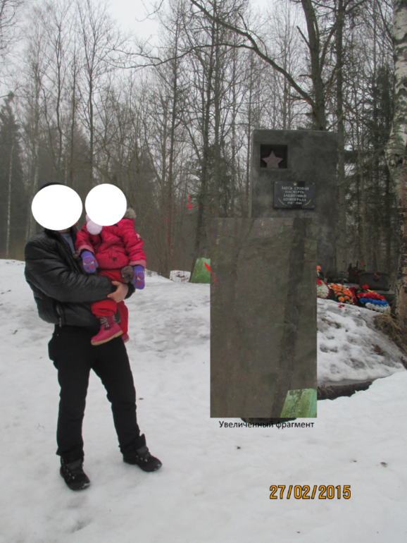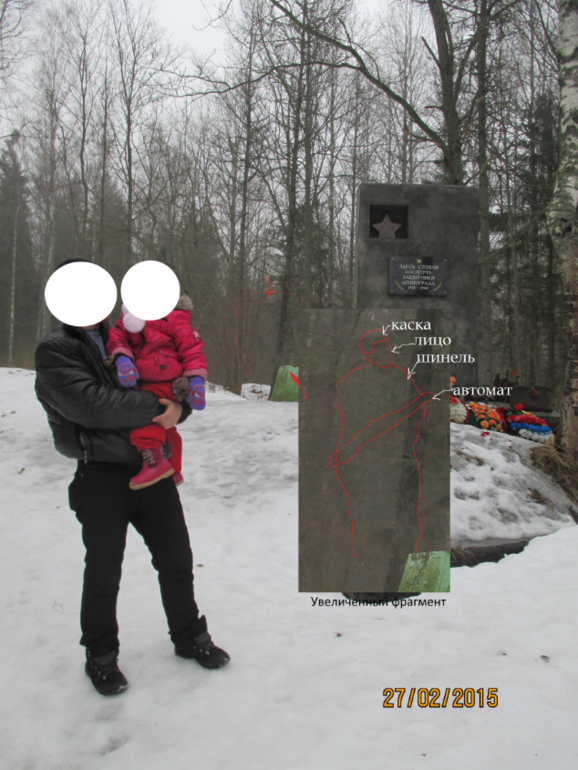 4.фото сделано совсем недавно(февраль 15 года).Я вижу призрака солдата,выглядывающего из-за деревьев.Этот фрагмент увеличила.На фото-муж и дочь,лица замазаны,т.к.отправляла в сообщество экстрасенсов)