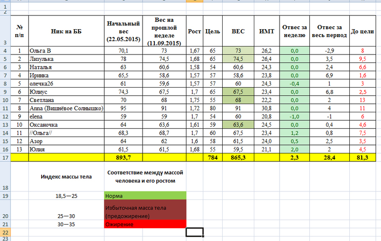 Ириш, возьмите меня обратно в худелки. Стыдно сказать, но за отпуск набрала лишка (((( с вами, надеюсь, будет проше бороться с лишним весом. Итак, рост 169 см, сейчас масса 67 кг, цель - 60 кг. Эээх. А табличку оставляй, дисциплина должна быть! Когда результаты за неделю даём? Извини, забыла уже.