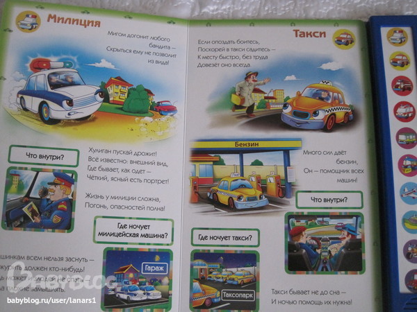 Идея книги мне нравится. Здесь показывается, что внутри машины и где она ночует. Каждой странице соответствует своя звуковая кнопка. Единственное, что мне не понравилось - это стихи. После стихов Барто, Михалкова, Чуковского и др. эти стихи какие-то корявые для моего восприятия. Но моим малышам я думаю будет интересно, потому что машины для них любимые игрушки. Остальные 3 книжки я брала в подарок. В книжке "Друзья на ферме" при нажатии на кнопку звучит стихотворение про животных на странице со звуками этих же животных . Стишки хорошие. я думаю, что подружкиному сыночку она понравится.