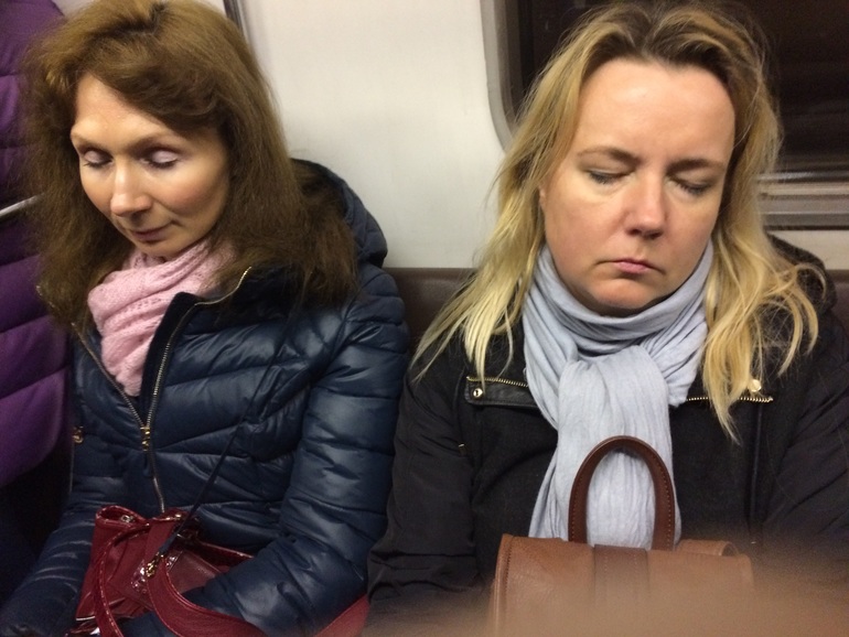Если в вагон вдруг зашел пожилой человек, беременная или женщина с ребенком, надо сразу закрыть глаза. Там рядом с этими флэшмобщицами еще и мужик сидел, типа тоже спал. Но он в кадр не попал. Сидели такие, и тут бац, как только зашел ребенок 4 лет, сразу, хоп- и спать!