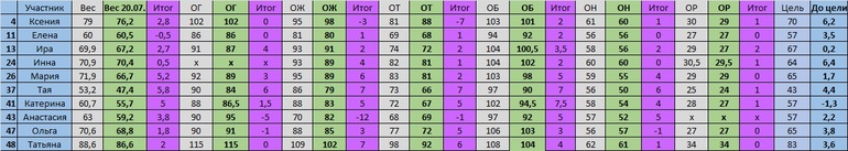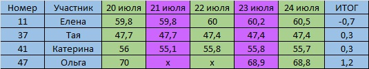 А теперь к таблицам! Начнем с таблиц колебания веса за прошлую и нынешнюю недели: