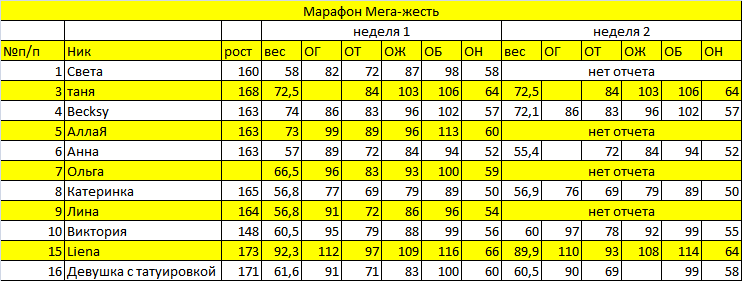вес 59,1 ОГ 99 ОТ 80 ОБ 99 ОН 52 (объемы увеличились перед М, хотя может я как-то криво мерию каждый раз) Но в платье в которое 2 года не могу влезть-влезла, я довольна марафоном. С питание все налажено-исключение выходные-не знаю как с этим бороться. Правда мороженое, квас, пиво уже не пью как раньше. Но все равно шашлык, картошка и другие калорийности есть в моем рационе. Спорт надо добавить...