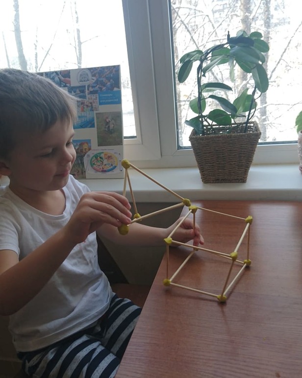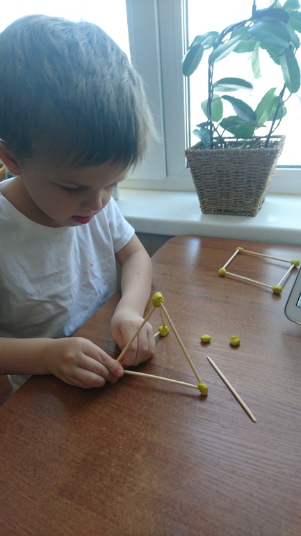 3. Гороховый конструктор. Скатываем шарики из пластилина и берем палочки (мы брали шпажки). Попросила сделать сначала квадрат и треугольник. А потом с помощью картинки и моих пояснений сделать куб и пирамиду.