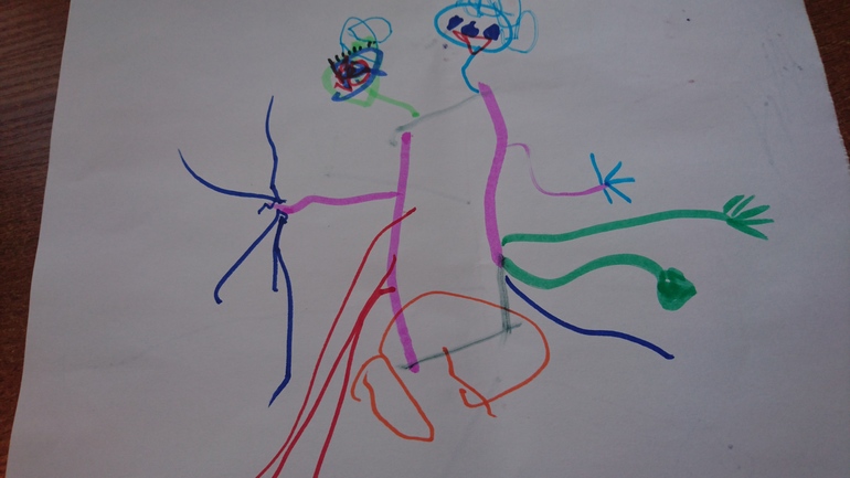4. Играли в игру "Нарисуй монстра". Сначала нарисовал туловище монстра, а потом кидали игральный кубик, задавая вопрос «Сколько у монстра голов? Глаз? Рук? Пальцев?» И т.д. и Яр потом это в количестве выпавшем на кубике, пририсовывал. Хохотал! Просил ещё и ещё монстров.