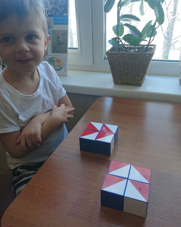 2. Играли с кубиками Никитина. Сначала делали упражнения по книге Никитина, а потом играли в игру от Жени Кац "Сделай наоборот". То есть мама делает какую-то фигуру из кубиков, например ёлочку красную, а ребенок делает соответственно тоже ёлочку, но белую и т.д
