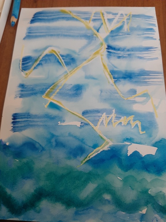 А теперь давай попробуем нарисовать грозу. Будем рисовать с тобой картину «Гроза на море» . Нам понадобится акварель и масляная пастель.