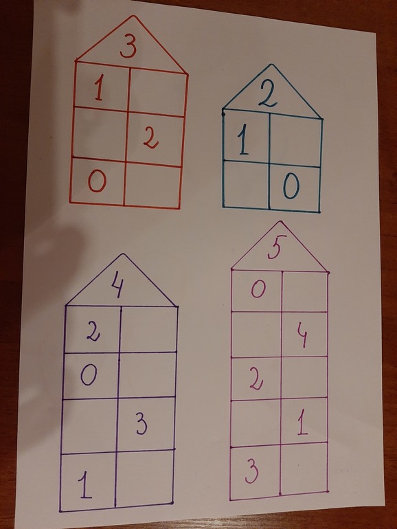 Популярное задание на состав числа. Рисуем домики. На крыше пишем число (например 4) и делим домик на этажи. На каждом этаже пишем по одной цифре, другую должен поставить ребенок, чтобы в сумме чисел каждого этажа получилось число, указанное на крыше.