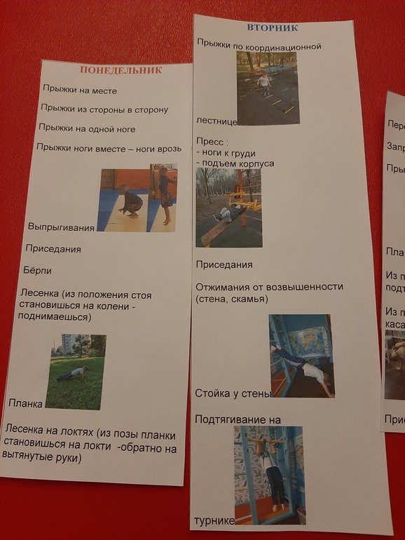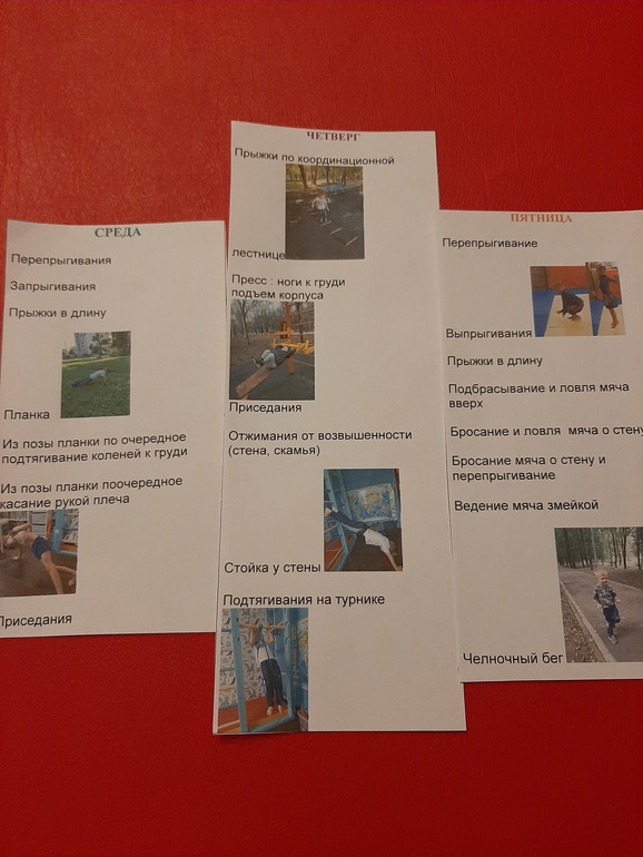 Это наши карточки по физухе. К нашим обычным упражнениям еще добавила упражнения из норм ГТО для 6-8 лет челночный бег и прыжки в длинну.