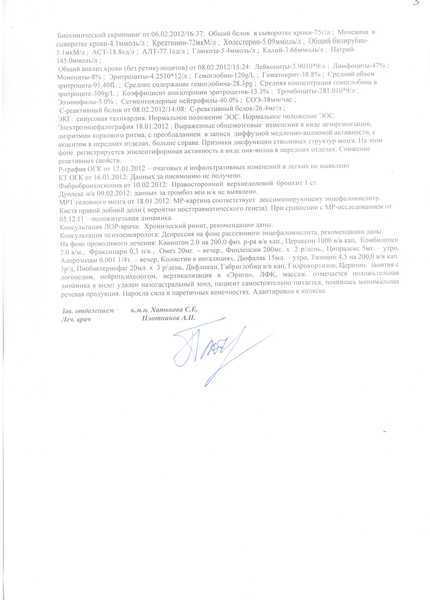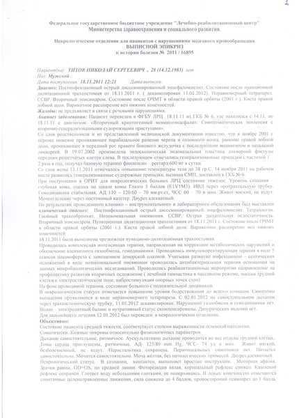 После выхода из комы в реанимации находился до 24 января, после чего был переведен в палату. На сегодняшний день: парез правой стороны, обездвижен. На протяжении всего времени не разговаривал, 08.02.2012г.после занятий с логопедом стала появлятся шепотная речь в виде отдельных слов. На протяжении всех 3хмесяцев держалась температура,нозокомиальная пневмония вызванная Синегнойной палочкой. Сейчас ему постоянно нужна реабилитация,т.к.у него полностью парализована правая сторона.