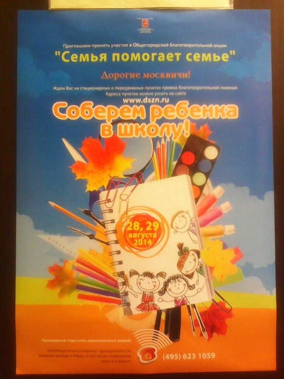 02. ОбъявленияСоберем ребенка в школу!!!! УВАЖАЕМЫЕ ЖИТЕЛИ района Нагатинский Затон!!! По Москве проводится общегородская Благотворительная акция !!! "Соберем ребенка в школу" Ждем Вас на стационарных и передвижных пунктах приема благотворительной помощи, по адресам: 1. ул. Новинки, на площади Ярмарки выходного дня; 2. Нагатинская набережная, д.44, корп.1 (помещение ГБУ ЦСПСиД "Берегиня". Принимаются вещи (б/у, новые, канцелярские принадлежности, рюкзаки и все, что необходимо детям в школу). За ранее благодарим !!! Подробную информацию Вы можете узнать по телефону 8 499 782-00-81