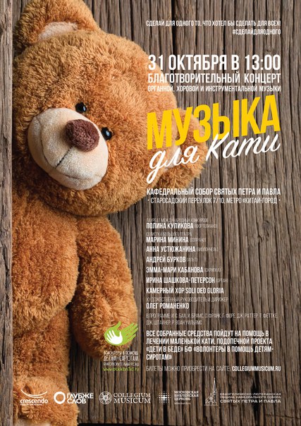 31 октября в Соборе Святых Петра и Павла в Москве состоится концерт органной, хоровой и инструментальной музыки в поддержку подопечной проекта "Дети в беде" фонда "Волонтеры в помощь детям-сиротам" маленькой девочке Кате.