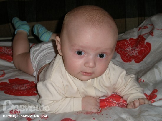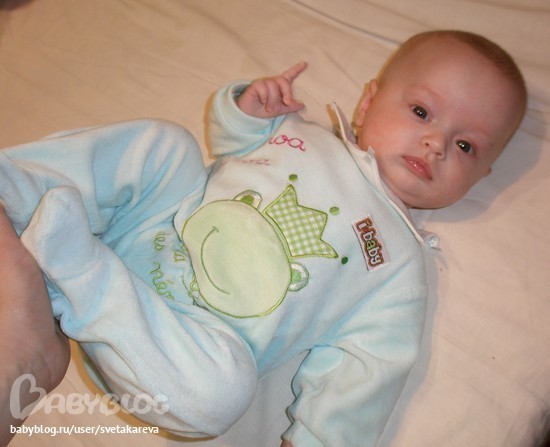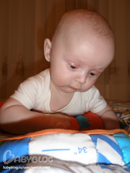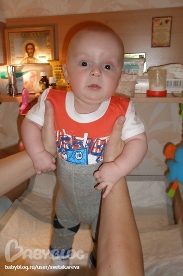У него очень много сил, сильный удар ногой (особенно маме в грудь). Стал в положении на животике подтягивать к себе ножки, как буд-то ползти собирается.