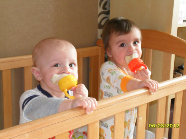 Попробуй с яблока, 2-3 дольки положи, только крышку очень сильно закручивай))) А то сеточку могут выдернуть! У меня яблоки и груши лежат в холодильнике, я им холодненькие даю. Это как прорезыватель охлажденный получается)))