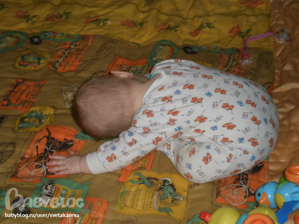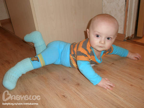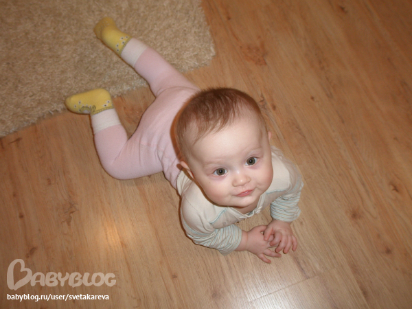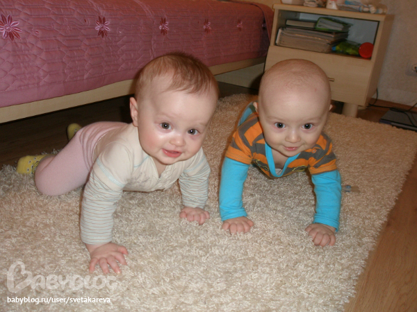 - все активней ползают (Аня тоже поползла), пока по пластунски, но уже есть предпосылки согнуть коленочки. Ползают оба одинаково, подпирают правую ножку и ею отталкиваются и перебирают руками