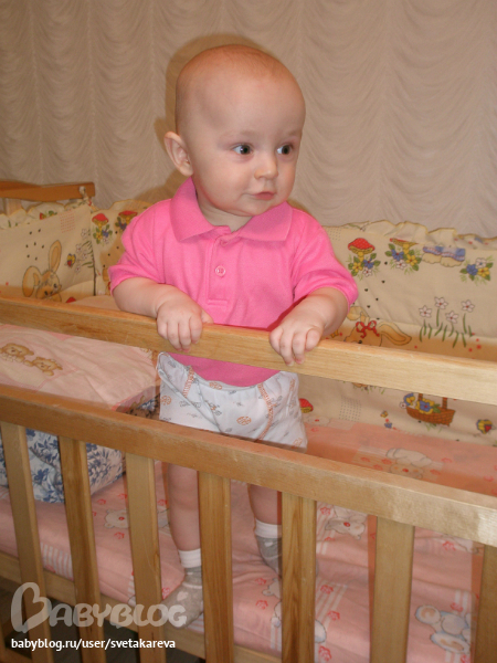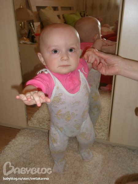 - оба встают у опоры (в кроватке, у дивана, об мебель), пытаются встать об мою ногу. Это главное наше достижение к 8 месяцу