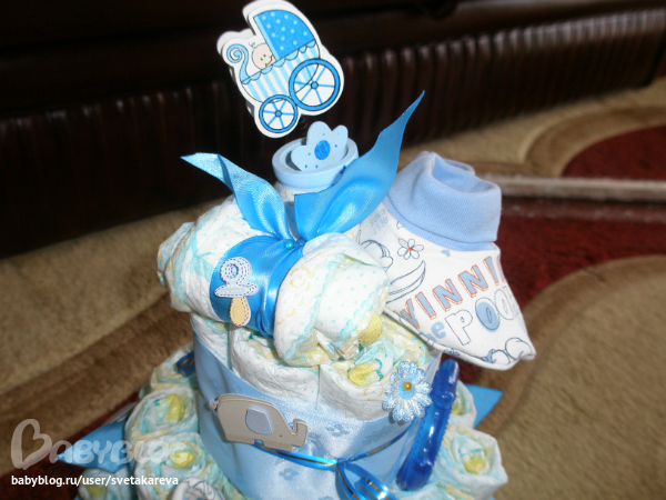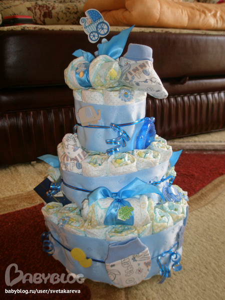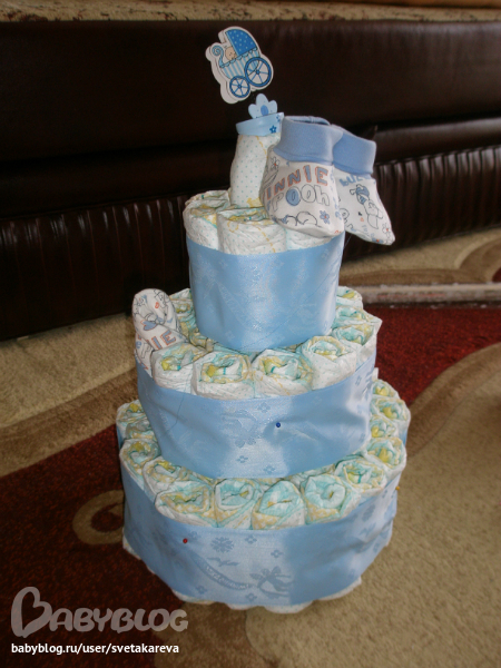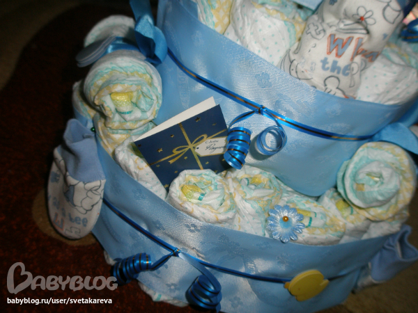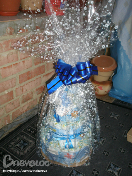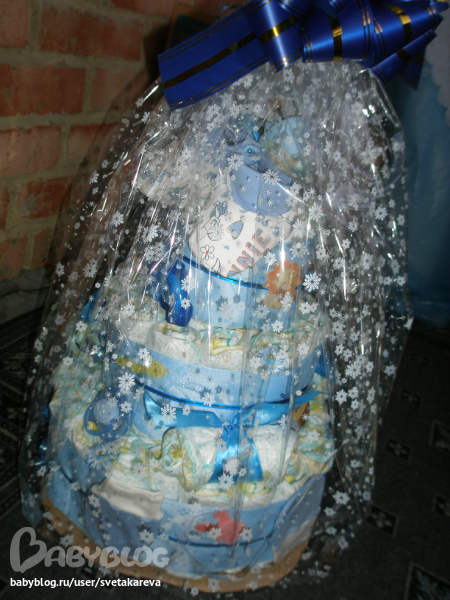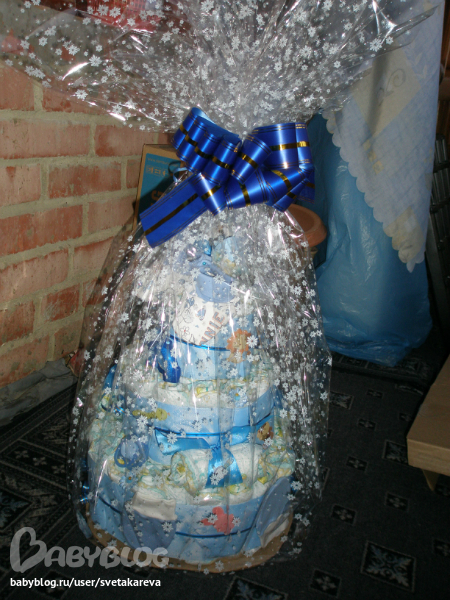 а нам мужу на работе на рождение двойни тоже подарили многоярусный торт из памперсов :) фотку еще на комп не заливала :) иначе бы похвасталась :)