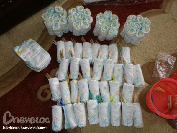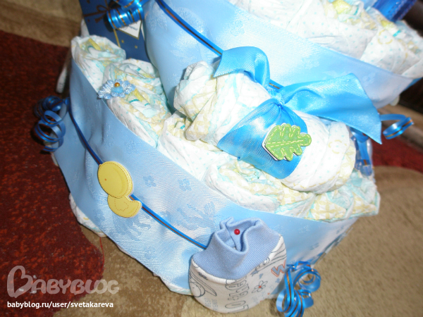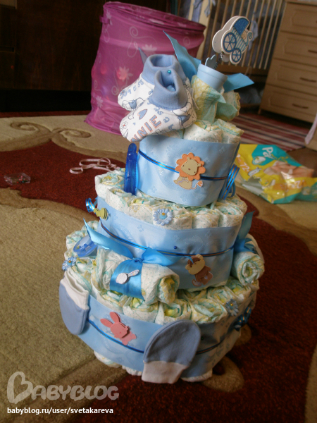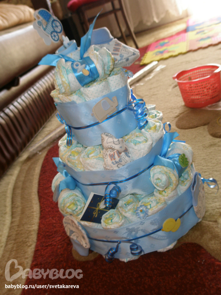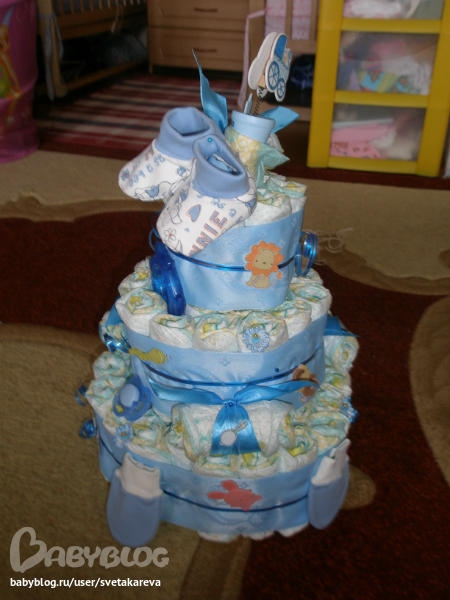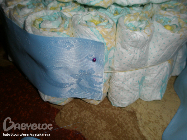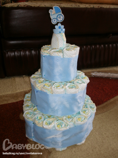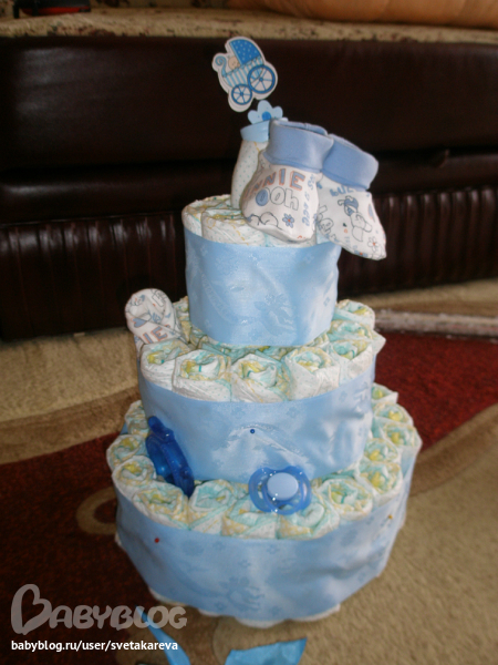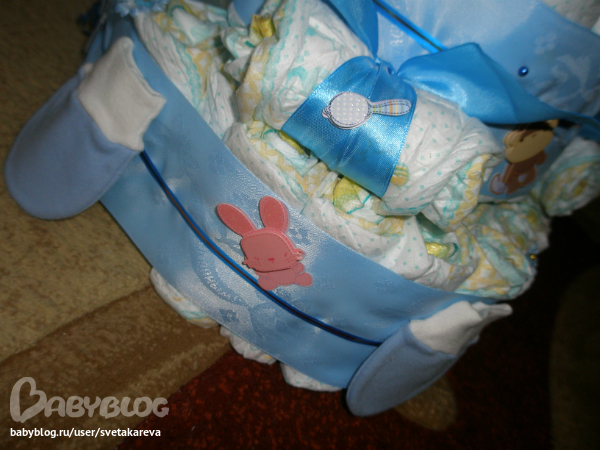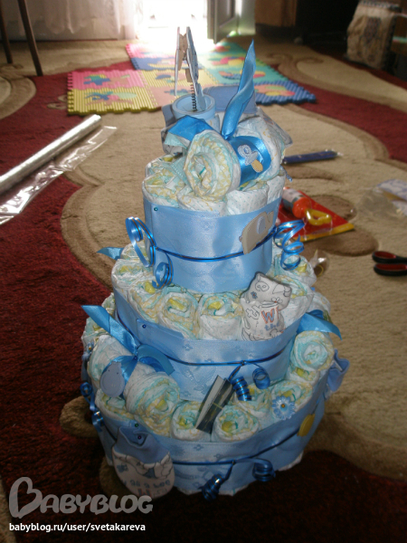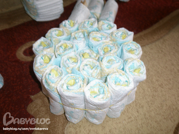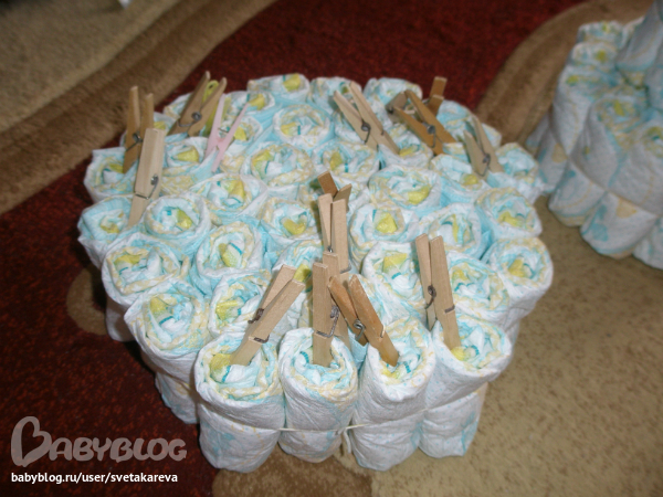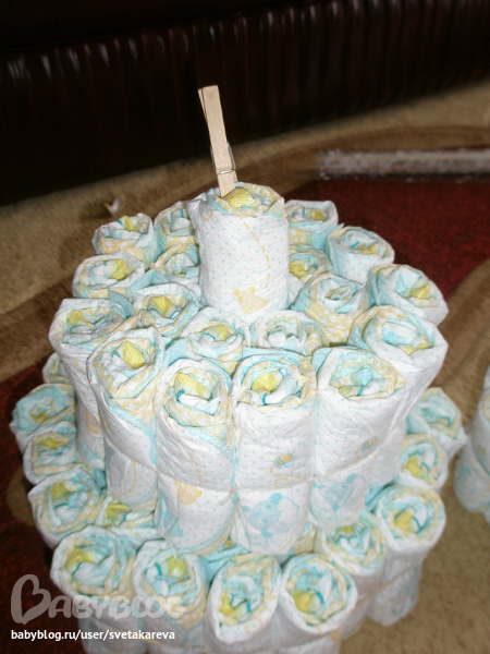 Торт, конечно, вышел симпатичный.....Но меня аж....трухануло: 1. Вы это делали на ПОЛУ!!!! вы реально думаете, что потом можно такие памперсы использовать? 2. Булавку!!! прям в подгузник!!! Во-первых, при разборе такого тортика можно конкретно пораниться, а во-вторых, повторюсь...вы реально думаете, чт отакой подгузник можно потом использовать?