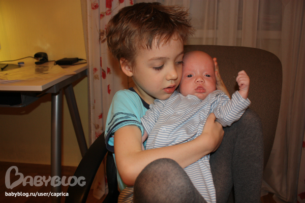 Мишутка и Тёмочка. Как осторожно держит братика)))
