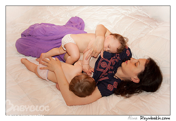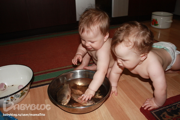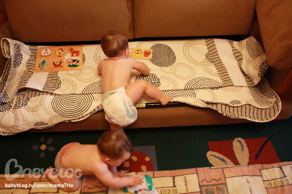 Научились залазить и слазить сами с дивана и кровати, причем Маша сразу поняла как надо, и с первого раза поворачивалась на животик и сползала вниз ножками, а Саша долго баловалась, подползала близко к краю и свисала головой, но когда ей надо слезть, обязательно разворачивается как надо все делает:
