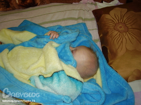 Причем по полной программе, вместе с ручками. Днем спят без пеленок, раза три, по времени от часа до трех....Но стоит их уложить на ночь не связав по рукам и ногам, начинается бесконечный марафон, кто меньше поспит, кто сильнее поорет..))) Один уснул - второй проснулся - орет - просыпается первый - орут хором - растащим по комнатам - усыпим (кто с титей, кто с соской) - только ляжем спать, все начинается по новой. Измученные дети засыпают к шести утра. Неспавший папик - на работу, мамик ... да тоже дел полно, спатьуже некогда...Так вот, прожили мы трое суток в таком режиме, и я решила опять их завернуть в пеленки... так ведь спят заразы всю ночь, с 23 до 5,30 это уж обязательно... А если успеть их накормить, чтоб не сильно проснулись, потом еще до 9 утра топят....А днем спят... как зайки... Толик так часа по 4 иной раз спит, что ночью то происходит? Принимаю любые советы..))) На фото: это спит Толик, днем, под одеялком...четвертый час сна...
