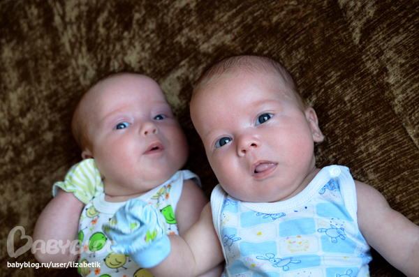 Оба осознали что в голову можно не тлько есть, но ею можно еще и вертеть, научились держать голову и смотреть по сторонам, поворачиваются с боку на бок, любят спать в коляске, спят пока много, бодрствуют в основном ближе к вечеру, когда папа уже дома, не любят лежать на животе, едят днем раз в 3-4 часа, ночью раз в 5-7 часов.