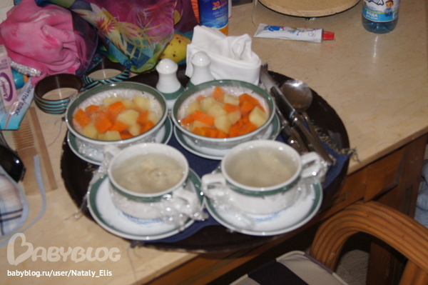 А оказалось, что там нечего купить – детское питание только фруктовое и овощное, да и то непонятного состава, каши тоже в основном рисовые. И все. Пришлось договариваться в отеле и нам готовили для детей отдельно, приносили в номер к 12.00 по местному времени. Рецепты я писала на русском языке сразу на всю неделю, передавала эти листочки девушке Инге на рецепшине (эта замечательная девушка решала все проблемы русских туристов), а Инга уже объясняла шеф-повару что нужно приготовить и как. В общем нам сразу стало легче. Я просила общий выход блюда 800 гр – это как раз на 2 кормления.