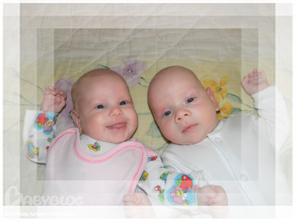 Моим котяткам целых два месяца!Так быстро время пролетело!Они очень изменились и внешне и характером.Животики все меньше нас беспокоят-это самое главное!Стали мешать друг другу спать в кроватке,поэтому мы их расселили по разным кроваткам))Теперь все семейство спит с 23ч до 6-7 утра!!Кайф))Тимоха стал меньше кряхтеть))Но прозвище Медведь у него остается еще)))Вообще Тим у нас очень улыбчивый и разговорчивый паренек!Особенно любит разговаривать с пчелками на мобиле))Любит купаться и делать зарядку,а еще он стал ТАКОЙ хомяк,уже 5400 весит))Если голодный или вылетела соса-узнает об этом весь дом)))Лизонька у нас дамочка серьезная))Улыбается больше папе,да и вообще мужскому полу,больше чем мне))Разговаривает по настроению,но обязательно выговаривает четкое "Агуу".Нравится ей следить за игрушками,трепать маму за волосы,купаться в пенке,когда мама делает массажик.Сколько весит не знаю.Вот пойдем в поликлинику и измеримся там.Лизок какает все так же раз в день.Зато прогресс- стала чаще есть титю,в отличии от Тима!Это меня очень радует,может все таки меньше смеси кушать будет хотя бы Лиза.А так все более менее спокойно.Когда одни с мамой так вообще дома тишина у нас,у меня много времени уходит на старшенького.А когда папа дома,они почему то начинают выпендриваться и требовать много внимания к себе,не знаю почему так))Вобщем растут мои двойнята,становятся все интереснее!Ну и немного фот