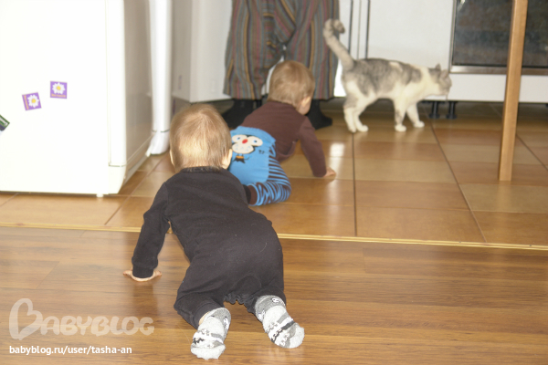 если дети сидят спокойно на полу, заняты игрушками, а потом резко срываются с места и ползут в одну сторону, то значит на горизонте появился ОН! и значит надо все бросить и бежать на выручку! а то они научились работать в команде и загоняют его в угол за 1 минуту!