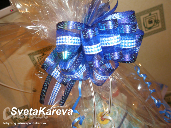 Очень красивый тортик! Молодец! Я помню ты когда-то делала тортик из памперсов наподобии этого! Пора бы открывать свое дело по изготовлению подарков своими руками :) Или уже открыла? Ну очень классно у тебя получается!