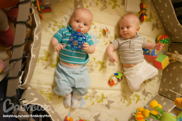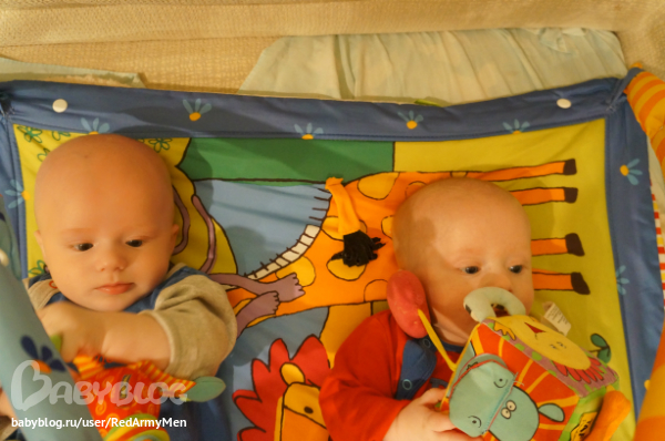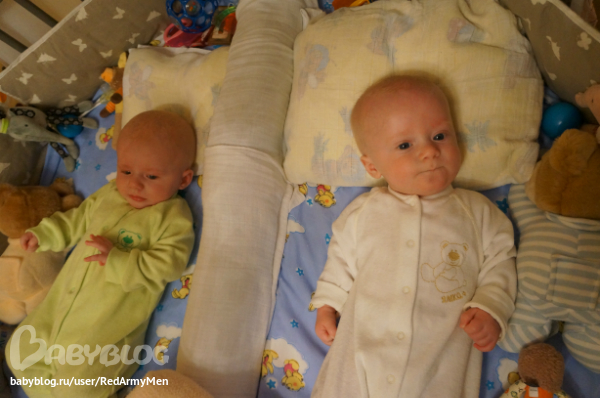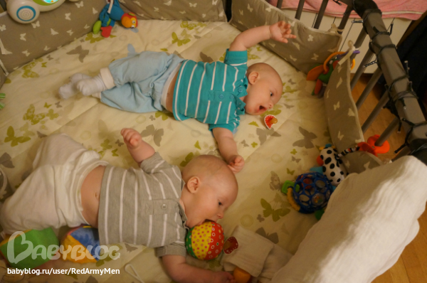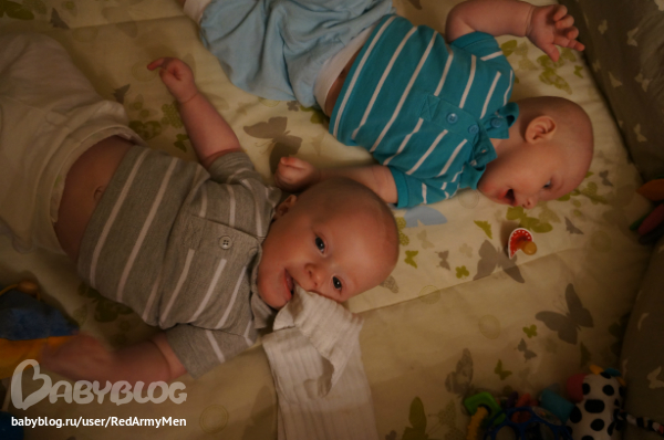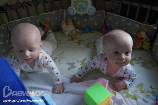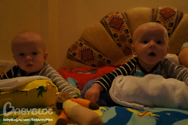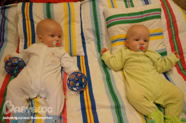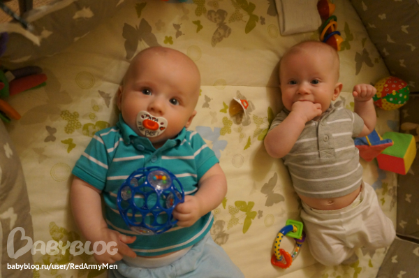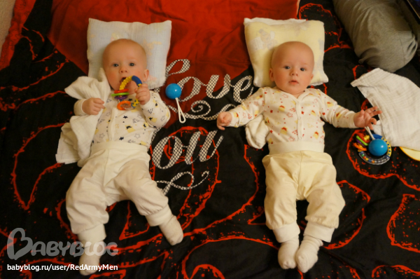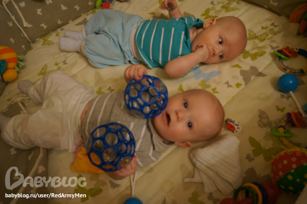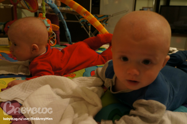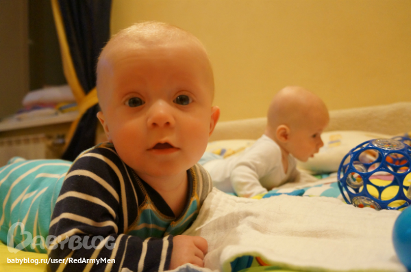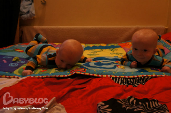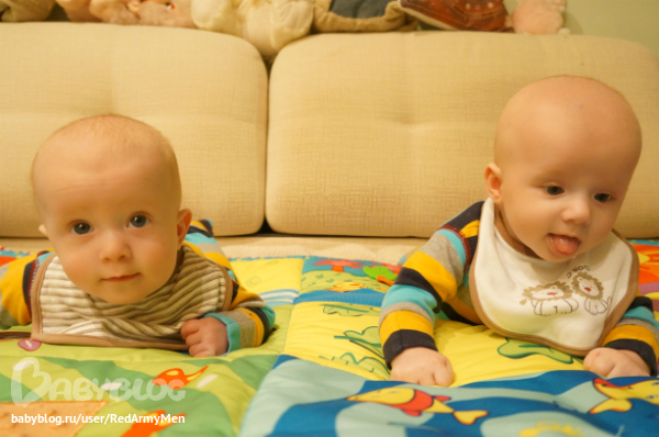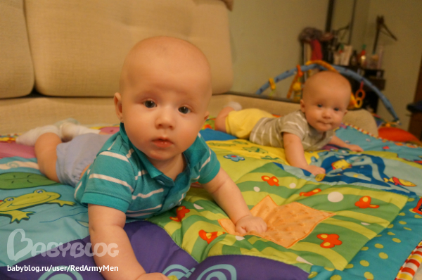 Стали потихоньку вводить прикорм и два раза в день кушаем кашки (гречневую, рисовую и кукурузную). Тетя врач сказала что скоро нам дадут попробовать овощное пюре, ждем не дождемся)) Кушать стали больше, мы ж растем и теперь два или три кормления кушаем по 210 гр в остальные разы по 175гр. Мы вроде бы и не толстенькие, поэтому можно и побольше кушать))) А еще к нам ходит дядя Сережа, он нас массажирует. Нам очень нравится, после массажа дрыхнем по 3-4 часа без силенок. Потихоньку учимся переворачиваться, у нас иногда получается)) Теперь мы больше любим проводить время на животиках и пытаться ползать)) У Ваньки например получается ползти назад, а у Мишки крутиться на животе))) Ничего скоро поползем, не догоните)))