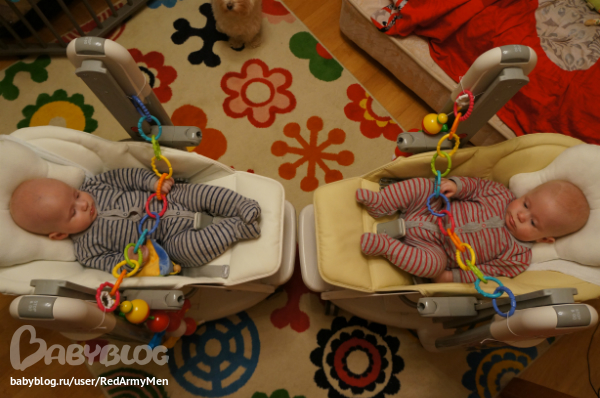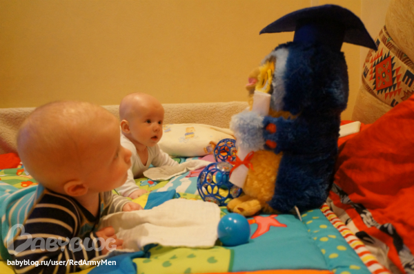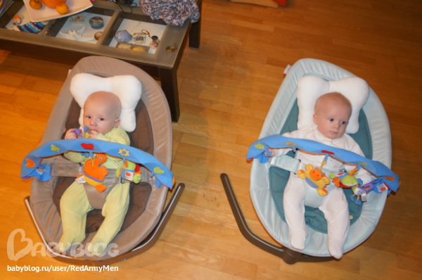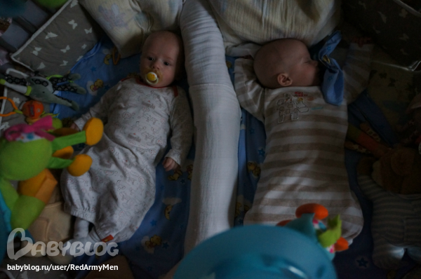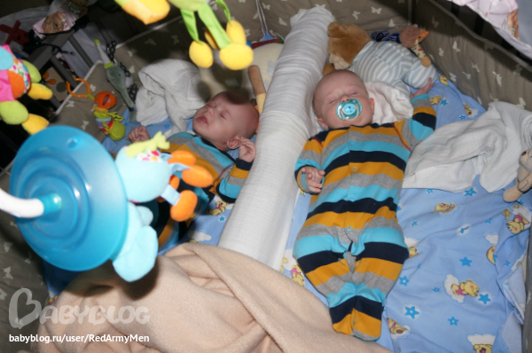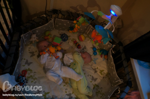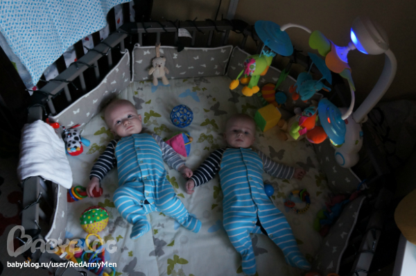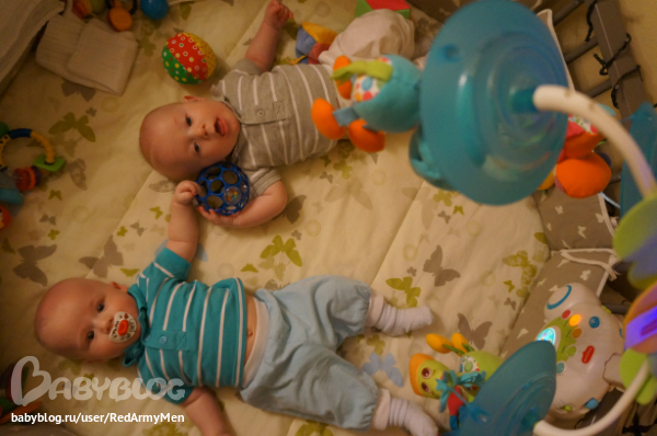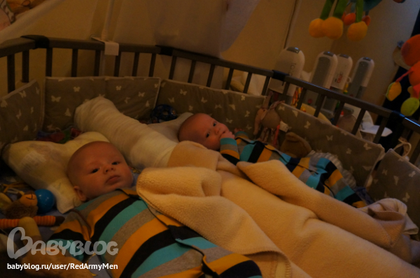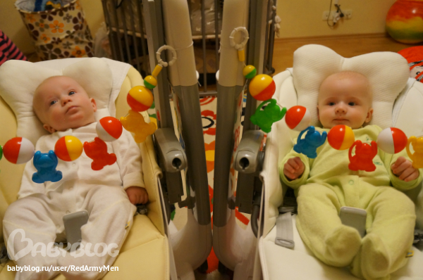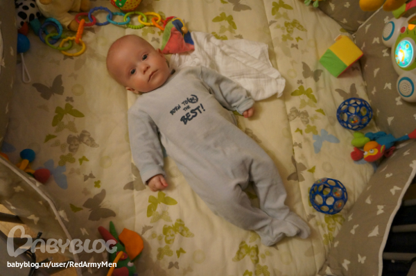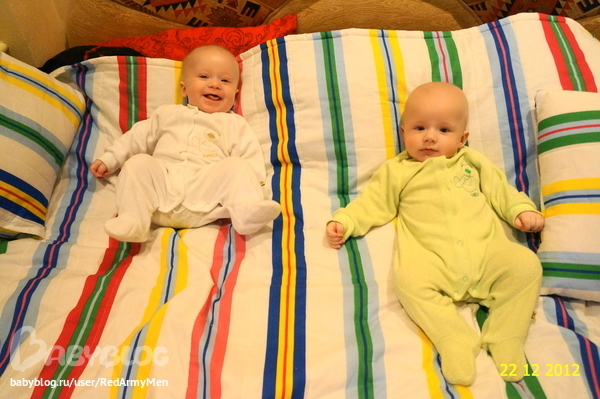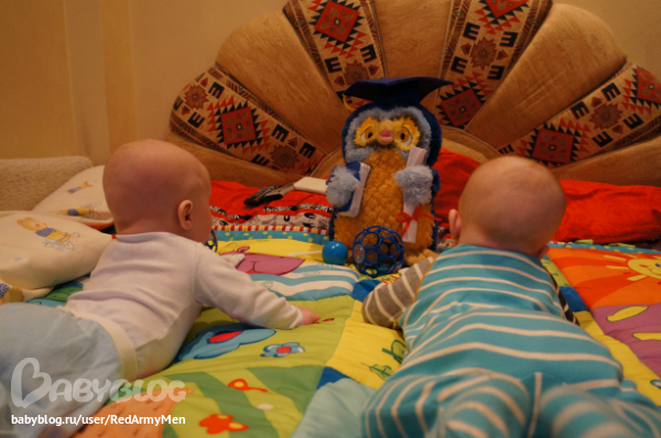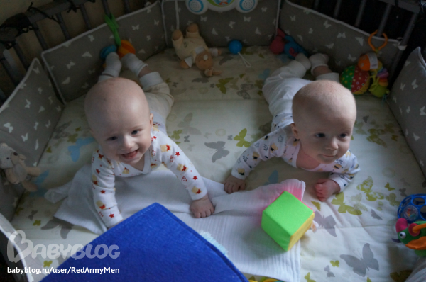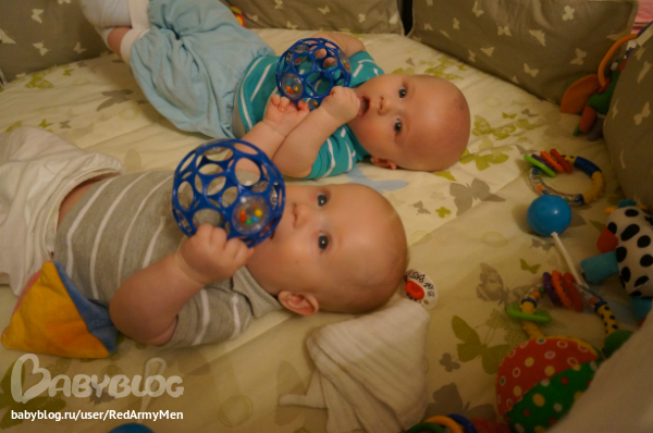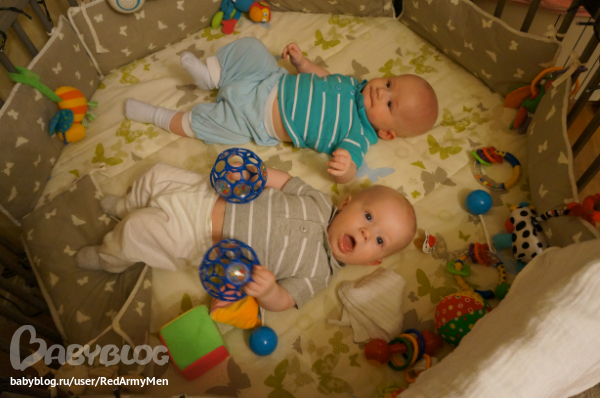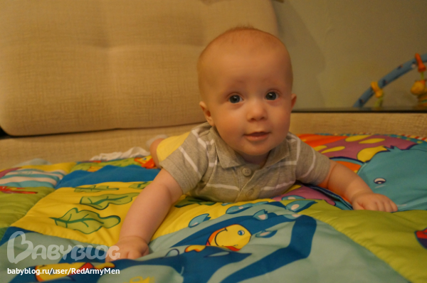 Стали потихоньку вводить прикорм и два раза в день кушаем кашки (гречневую, рисовую и кукурузную). Тетя врач сказала что скоро нам дадут попробовать овощное пюре, ждем не дождемся)) Кушать стали больше, мы ж растем и теперь два или три кормления кушаем по 210 гр в остальные разы по 175гр. Мы вроде бы и не толстенькие, поэтому можно и побольше кушать))) А еще к нам ходит дядя Сережа, он нас массажирует. Нам очень нравится, после массажа дрыхнем по 3-4 часа без силенок. Потихоньку учимся переворачиваться, у нас иногда получается)) Теперь мы больше любим проводить время на животиках и пытаться ползать)) У Ваньки например получается ползти назад, а у Мишки крутиться на животе))) Ничего скоро поползем, не догоните)))