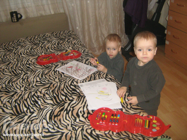 А вот мы уже дома разбираем подарки. Книжку-развивайку и набор творческий. карандашики и фломзики.