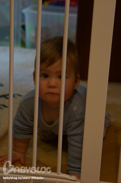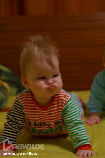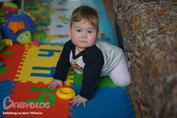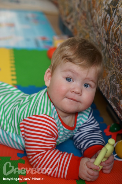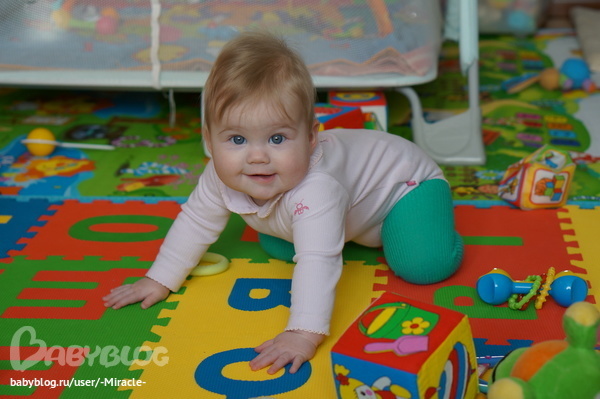 Ровно в 7 месяцев самостоятельно сел, умничка наш! Правда потом забросил это дело на пару недель, но сейчас постоянно садится сам. А в 7 месяцев и 10 дней пополз на четвереньках! Сейчас комнату проползает секунд за 7! Начал рваться в коридор, к грязным ботинкам, пришлось ставить калитку на дверь. Любит всю технику, начиная от чайника и заканчивая кондеем, может подолгу рассматривать их и пытаться разобрать то, до чего дотягиваются шаловливые ручки. Зубов пока нет, но точим все, что попадается под руку.
