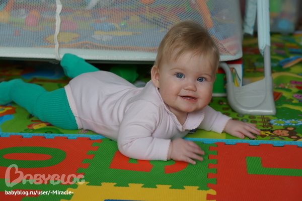 Ползать на четвереньках Варька похоже и не собирается, ее устраивает передвижение по-пластунски, ну а на дальние расстояния перекатами. Правда стоит на четвереньках и качается, а также из этого положения выпрямляет руки и ноги и поднимается от пола.