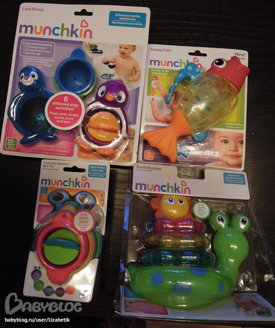 Игрухи в основном для водных процедур хотя мои уже освоили на суше (нижний правый угол) и минут 20 вокруг нее шобуршатся, а та, что - вообще тема, она и стаканчики, и пирамида, и гусеничка, хош на суше хош в воде играй, верхние 2 еще не распечатывала, но все равно ими двольна :)