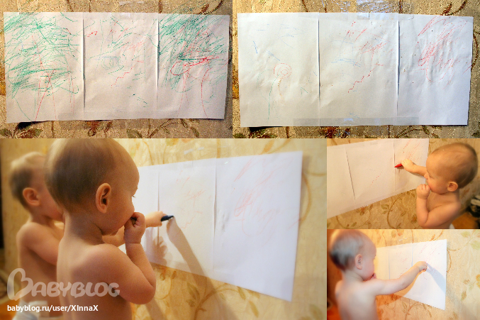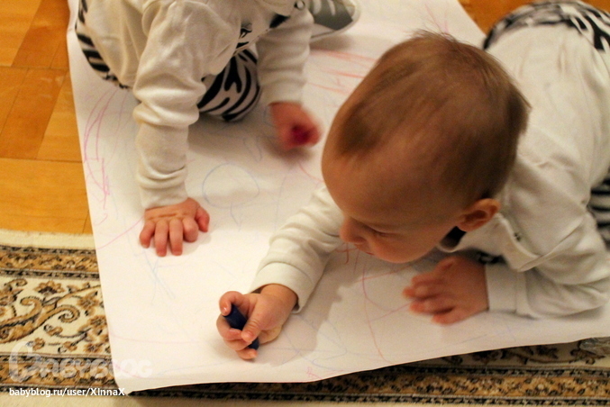 В 10 месяцев состоялся наш первый печальный опыт с пальчиковыми красками и я решила, что спешить не стоит. А тут недавно Яромир стал забирать ручку у дедушки и я решила, что пора доставать карандаши. И вот уже неделю они с удовольствием рисуют )) Особенно это нравится Яромиру. Святослав больше бегает с карандашом по всей квартире: то на обоях черкнет, то на подоконнике, то на полу.