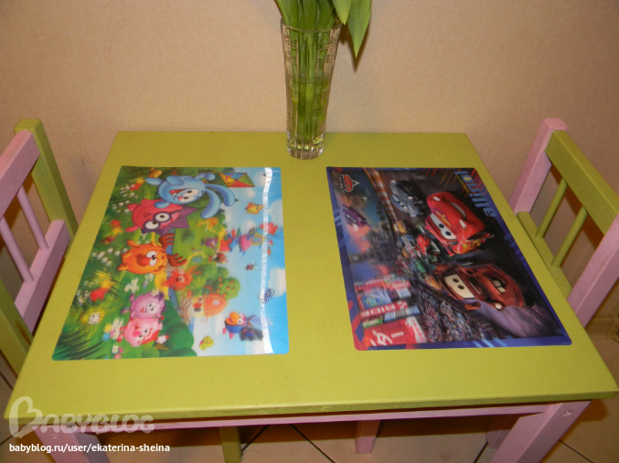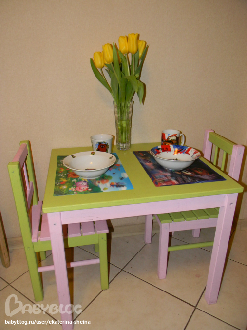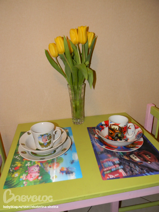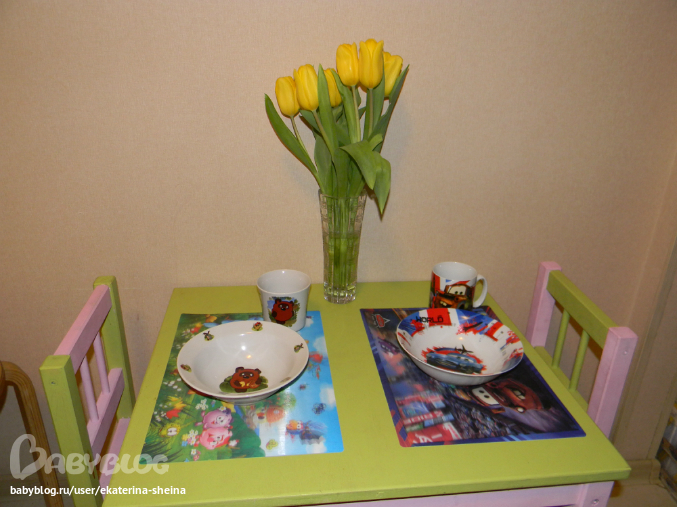 Наш столик, за которым детки кушают, рисуют и т.д. Тюльпанчики мамины, восьмимартовские:)