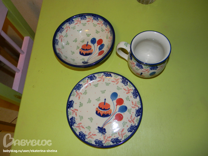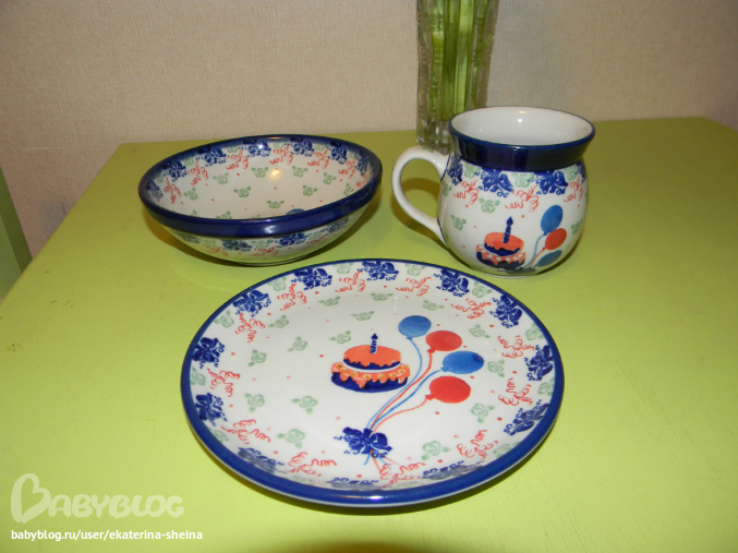 Ну а это наша старая посудка, если её можно старой назвать:) Керамика ручной работы, делают в Польше. Нам два таких набора моя клиентка на годовасие подарила.