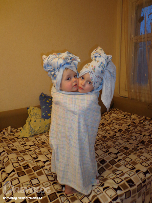 А еще вчера после "мойки детишек" я решила повторить опыт давний...... я раньше их всегда вместе из ванны вытаскивала, 1. тот который оставался в ванне начинал плакать, и наоборот уходя за вторым первый также плакал. А тут на днях папся их так принес и я решила сэкономить времячко и не бегать два раза, обмотала голову пеленками, малыши обнялись, я обвернула их полотенцем и как подняла, и пипец, я конечно дотащила их до нашей комнаты, (своя же ноша) но пипец, они блин столько весят!!!!!!!!!!!