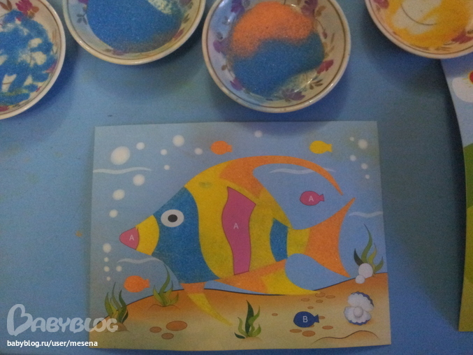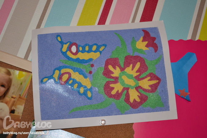 Как видно по картинке розовый песок мы не досыпали. Он оказался на полу:) Просила Сашу брать щепотку песка и аккуратно сыпать на картинку. После 20 минут работы ребенку надоело быть аккуратным и он стал смешивать песок, а затем насыпать его уже на готовую картину.