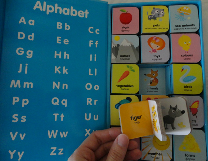 "Мои первые слова" - это самая любимая книжка моих детей :) их можно разбросать, сложить, поиграть в кубики, погрызть :) А вот с английскими словами припрятала на потом, когда подрастут.
